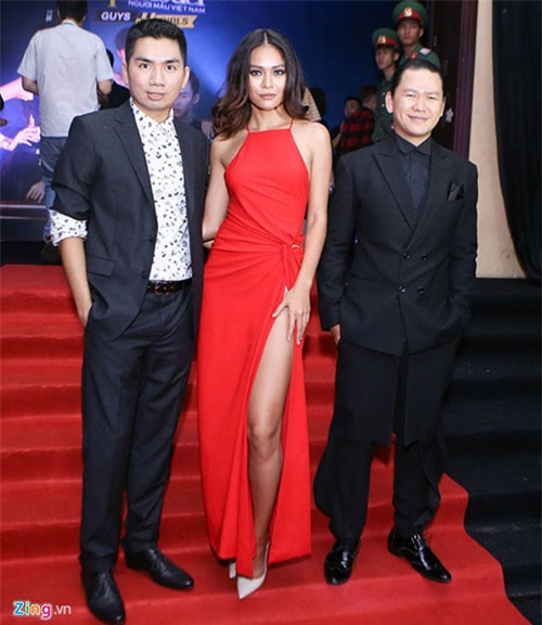 Một người đẹp khác cũng gây chú ý với đầm đỏ nóng bỏng là Mâu Thủy - quán quân Vietnam's Next Top Model 2013. Thiết kế xẻ cao giúp cô khoe khéo cặp chân thon dài trước ống kính.