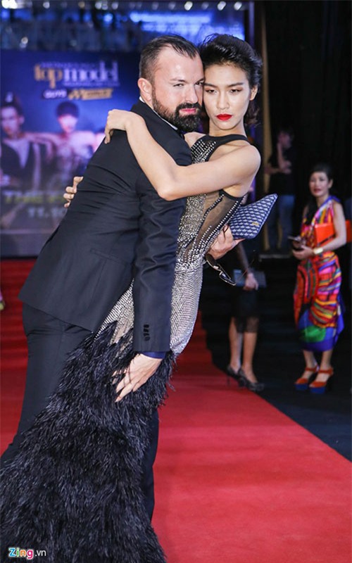 Quán quân Người mẫu Việt Nam 2014 - Nguyễn Oanh - khoe dáng gợi cảm với đầm lông vũ. Cô không ngại tạo dáng thân thiết với nhà thiết kế Julien Fournié trên thảm đỏ.