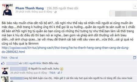Tuy nhiên, điều khiến nhiều người tỏ ra ngạc nhiên là khi gặp phép so sánh đơn thuần như vậy, bài viết cũng không có ý định đả kích nhưng Thanh Hằng bỗng dưng nổi giận đùng đùng, chẳng ngần ngại xả bực trên trang cá nhân.