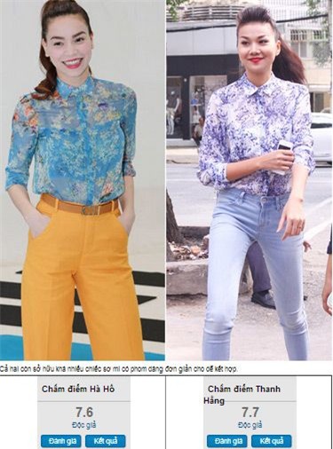 Mới đây, một trang báo mạng xuất hiện bài thời trang so sánh phong cách của Hồ Ngọc Hà và Thanh Hằng. Trang này chọn một số trang phục có vài điểm tương đồng trong cách phối đồ lẫn màu sắc của cả hai để chấm điểm. Tất nhiên, đều là những cô gái sành điệu "một chín, một mười", họ được tác giả dành nhiều lời tán thưởng và được cho điểm khá cao, không chênh lệch nhiều.
