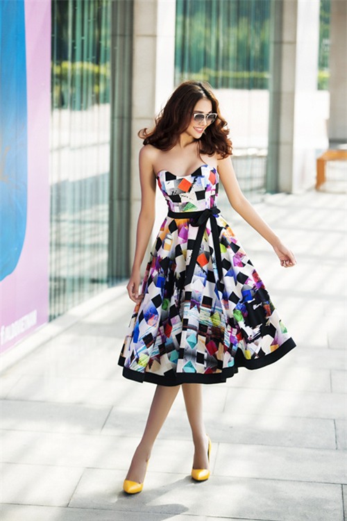 Siêu mẫu Thanh Hằng khoe dáng với những bộ váy xòe kết hợp họa tiết màu sắc.