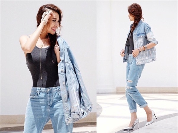 Thanh Hằng cũng không bỏ trào lưu denim on denim khi diện cả cây jean của thương hiệu bình dân với giá 6 triệu đồng nhưng lại rất ăn ý với đôi giày xám Zara và phụ kiện Hermes 50 triệu đồng.