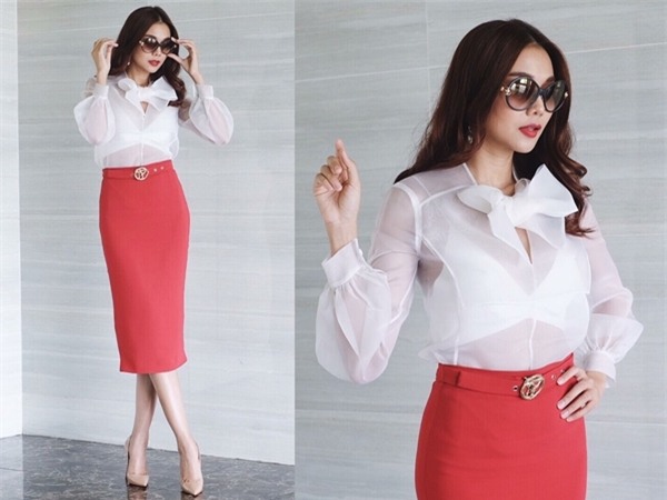 Chân váy đỏ đơn giản của nhãn hiệu Just Cavalli trị giá 12 triệu, giầy Louboutin 20 triệu, kính Shamballa 45 triệu.