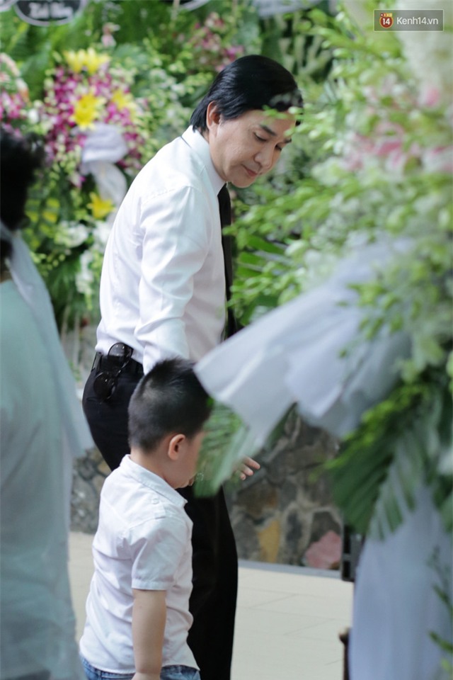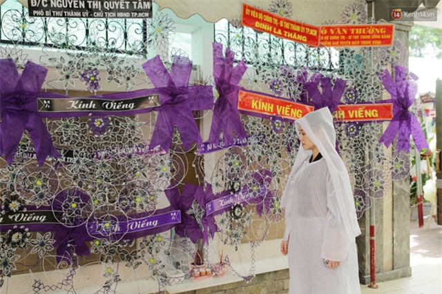 Quế Trân lặng lẽ đứng trước những vòng hoa tang viếng cha.