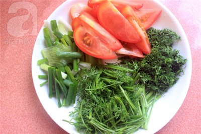 ![]() | ![]() Cà chua rửa sạch thái múi cau; hành và thì là rửa sạch cắt khúc, một phần rau thì là thái nhỏ. |