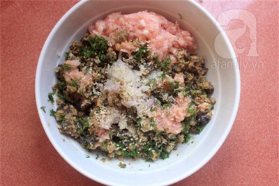![]() | ![]() Thịt ốc băm nhỏ cho vào tô, thêm thịt xay, một ít hành khô băm nhỏ, hạt nêm, muối bột canh, hạt tiêu, rau thì là thái nhỏ vào trộn đều cho ngấm gia vị. |
