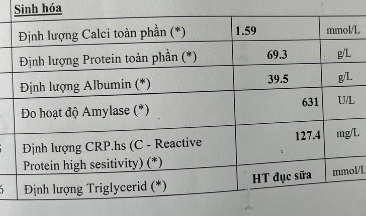 Khi nhập viện, xét nghiệm máu thấy huyết tương đục như nước gạo, triglyceride máu cao quá không đo được. Bệnh nhân được cấp cứu ở bệnh viện chuyên sâu, được lọc máu kịp thời, tình trạng viêm tuỵ cấp và mỡ máu cao cũng dần trở về bình thường.