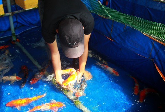 Mạnh đang bắt một con cá Koi Nhật có giá đến vài triệu đồng/con
