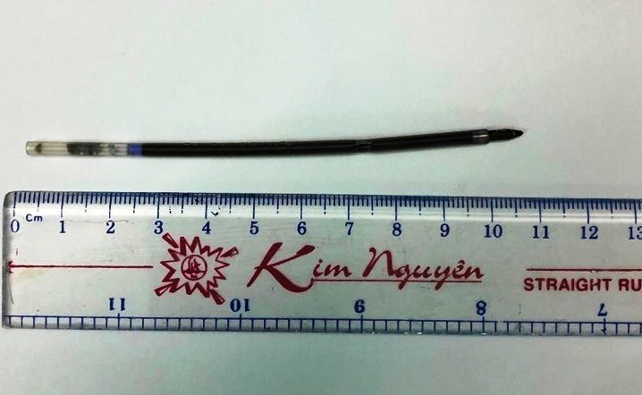 Dị vật ruột bút bi dài 11cm được gắp ra khỏi cơ thể chàng trai. Ảnh: BSCC