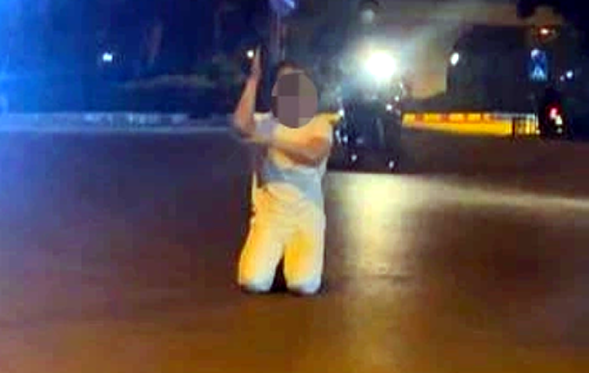 Sự việc chỉ dừng lại khi một người mặc áo đen – có vẻ là bạn của anh ta – tiến tới khuyên can. Chỉ khi người bạn này cũng quỳ xuống cùng, nam thanh niên mới chịu dừng lại và đứng dậy.