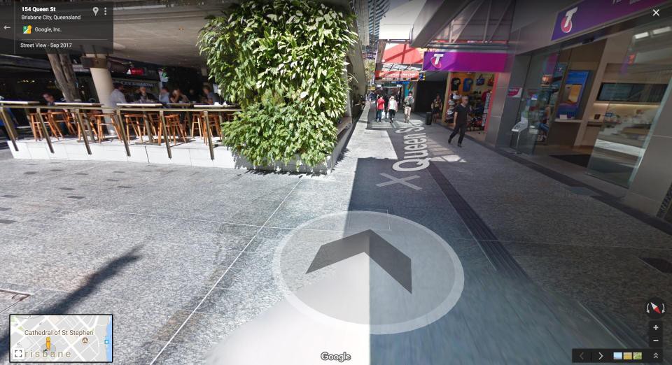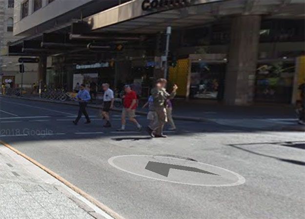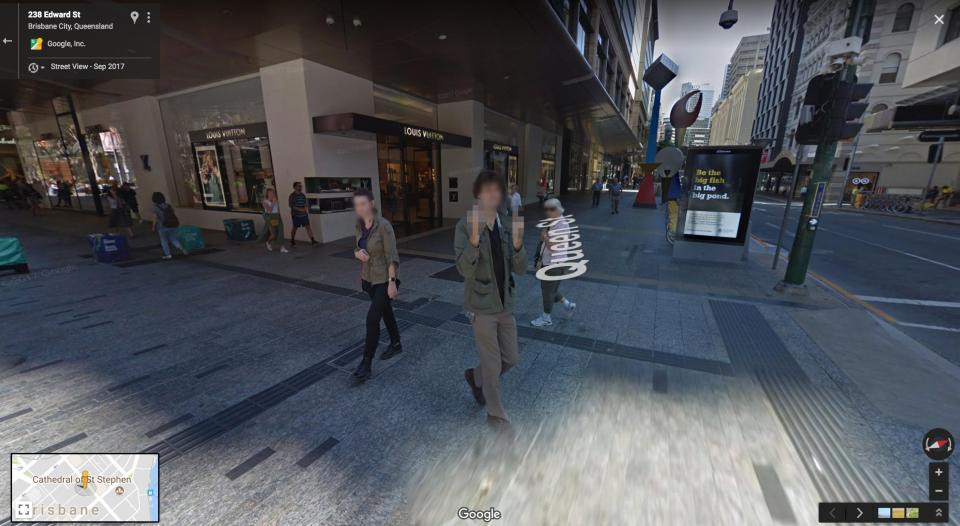 Ban đầu, Google đã cho thấy một bức ảnh tưởng như bình thường nhưng hóa ra khi phóng to lên lại là một thanh niên đang lăm lăm 2 ngón tay chĩa vào camera. Đáng chú ý là khi đó, thanh niên này vẫn đang mải qua đường và đi ngược hướng so với xe Google, nhưng không hiểu ma xui quỷ khiến làm sao mà lại quyết định đổi ý. Từ đó, anh này đi theo "uy hiếp" tinh thần Google suốt cả đoạn đường dài dọc Queen Street, kéo dài hơn 15 lần chụp tiếp theo, lần nào cũng có mặt chình ình trước camera.