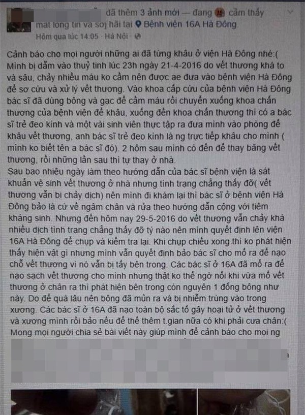 ngày 21/4/2016 anh giẫm phải mảnh thủy tinh, do vết thương khá to và