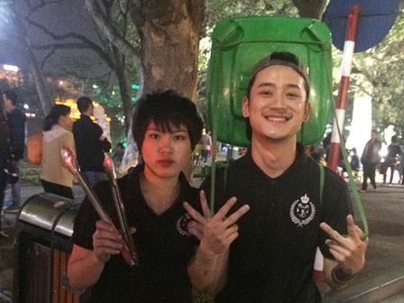 Len lỏi giữa dòng người đông đúc trên phố đi bộ Hà Nội vào ngày Chủ nhật, hai bạn trẻ Trần Minh Giang (24 tuổi) và Nguyễn Khánh Loan (16 tuổi) cặm cụi nhặt rác, góp phần giúp giữ vệ sinh chung.