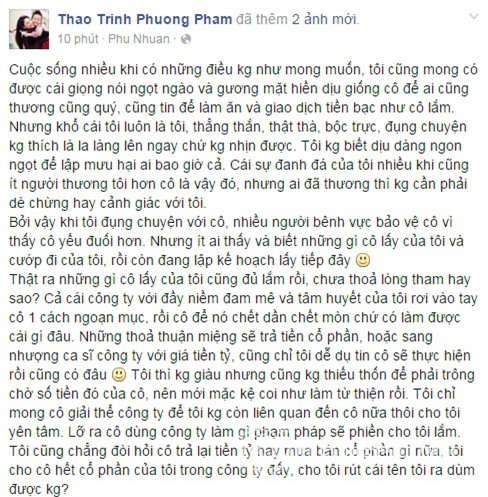 Trên trang cá nhân, Thanh Thảo đã chia sẻ một status rất dài để viết về Thúy Vinh. Trong đoạn đầu, Thanh Thảo cho rằng vì tính cô bộc trực, không ngọt ngào nên nữ ca sĩ không được mọi người "thương" như Thúy Vinh dù cho cựu người mẫu này đã cướp đi của "Búp bê" nhiều thứ: "Cuộc sống nhiều khi có những điều không như mong muốn, tôi cũng mong sở hữu được cái giọng nói ngọt ngào và gương mặt hiền dịu giống cô để ai cũng thương cũng quý, cũng tin để làm ăn và giao dịch tiền bạc. Nhưng khổ cái, tôi luôn là tôi, thẳng thắn, thật thà, bộc trực, đụng chuyện không thích là la làng lên ngay chứ không nhịn được.
