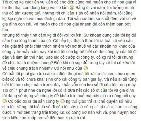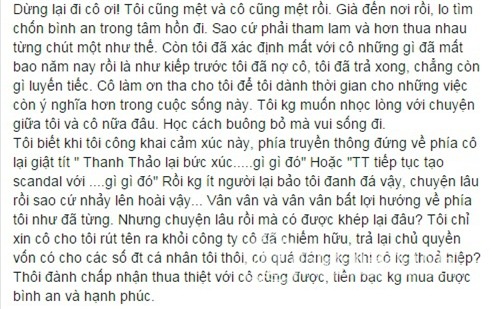 Nhưng chuyện lâu rồi mà có được khép lại đâu? Tôi chỉ xin cô cho tôi rút tên ra khỏi công ty cô đã chiếm hữu, trả lại chủ quyền vốn có cho các số điện thoại cá nhân tôi thôi, có quá đáng khi cô không thoả hiệp? Thôi đành chấp nhận thua thiệt với cô cũng được, tiền bạc không mua được bình an và hạnh phúc."