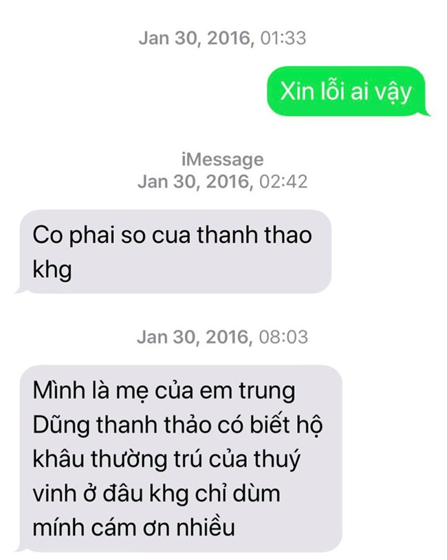 Thêm vào đó, Thanh Thảo cũng không quên chụp lại màn hình những tin nhắn "tố" Thuý Vinh lừa đảo rất nhiều phụ huynh học trò với số tiền tổng cộng lên tới gần 1 tỉ đồng. Liên lạc với cựu người mẫu Thuý Vinh để hiểu rõ sự việc, cựu người mẫu không bắt máy.