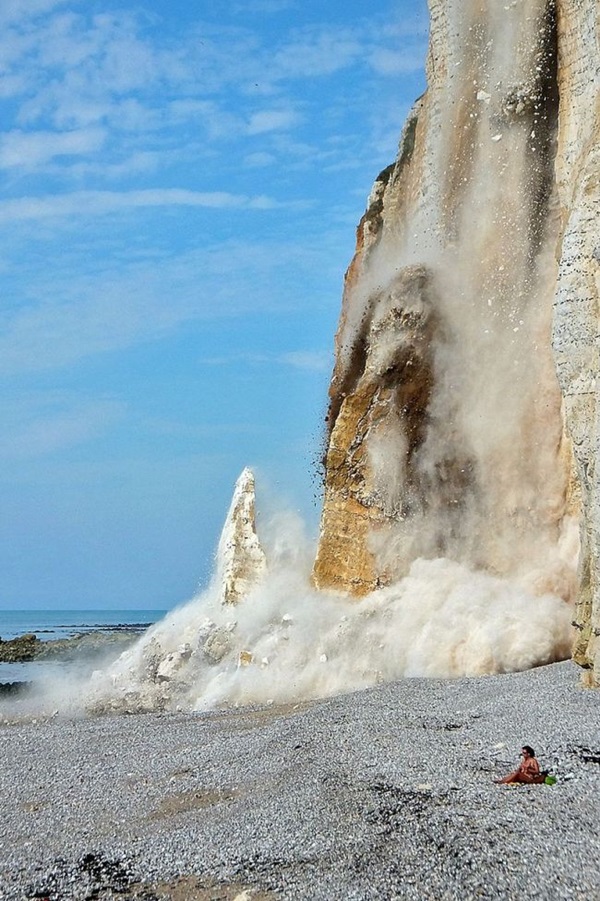 Nguyên nhân của hiện tượng vách đá ngay sát bờ biển đột nhiên sụp đổ là do thủy triều tràn vào và đập vào các vách đá, phần chân của chúng bị xói mòn, khiến phần trên dễ bị sụp đổ.