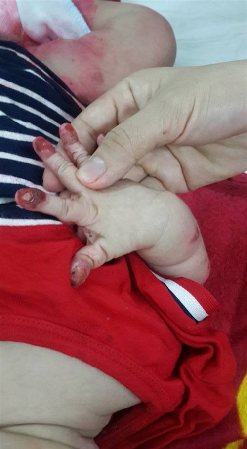 Hiện nay, toàn thân bé xuất hiện rất nhiều vùng lở loét, mẩn đỏ nghiêm trọng, tay chân bé đã bị "ăn mòn" gần hết, có nguy cơ dính liền các ngón lại với nhau.