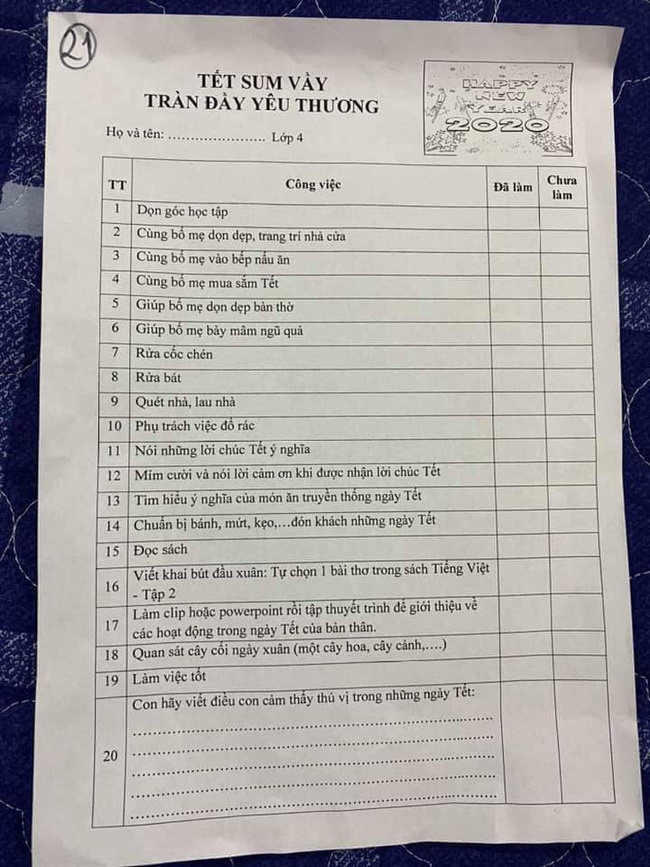 Theo đó, cô giáo đã đưa ra 20 yêu cầu cho các học sinh của mình thực hiện trong kỳ nghỉ Tết. Nhưng tất cả đó không phải là bài tập của một môn học Toán, Văn, Anh... nào mà vô cùng ý nghĩa, thiết thực cho trẻ nhỏ: Dọn góc học tập; cùng bố mẹ dọn dẹp, trang trí nhà cửa; cùng bố mẹ vào bếp nấu ăn; cùng bố mẹ sắm Tết, giúp bố mẹ lau dọn ban thờ; rửa bát; rửa cốc chén; tìm hiểu ý nghĩa của món ăn truyền thống ngày Tết; chuẩn bị bánh kẹo đón khách ngày Tết; đọc sách...