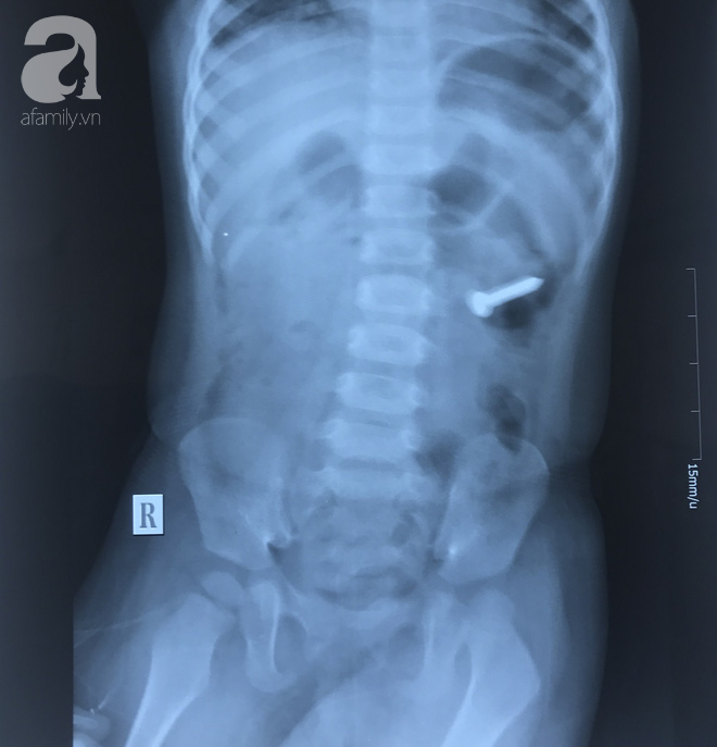Chiếc đinh có bề mặt xoắn ốc lại dài 3cm so với kích thước lồng ruột của bé 2 tuổi nên vô cùng nguy hiểm.