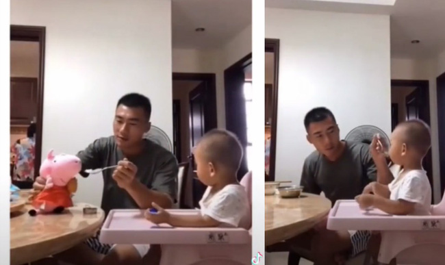 Lúc này, ông bố mới quay sang tiếp tục công việc đút cho con ăn, cậu bé giờ đây có vẻ nơm nớp sợ hãi, há miệng nhanh chóng, ăn ngon lành.