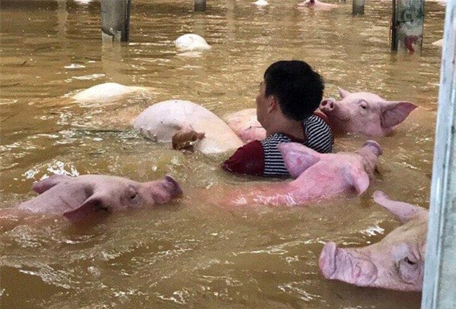 Vỡ đê, nước lũ sông Hép ở Thanh Hóa ngập sâu 2-3 m trong thời gian ngắn. Nhìn đàn lợn 6.000 con bơi trong nước nhưng chủ trang trại và nhiều người bất lực không thể giải cứu.