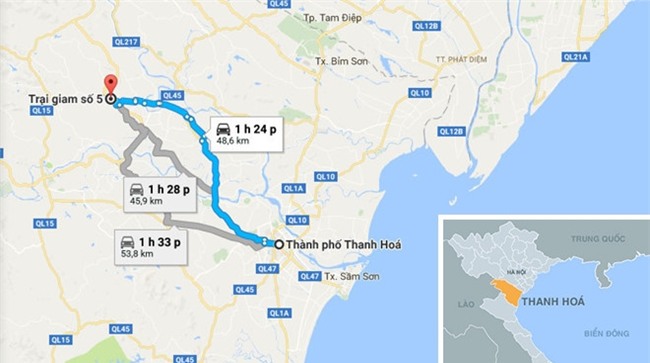 Nơi đàn lợn bị chết trong dòng nước lũ gần Trại giam số 5, cách TP Thanh Hóa hơn 50 km. Ảnh: Google Maps. |