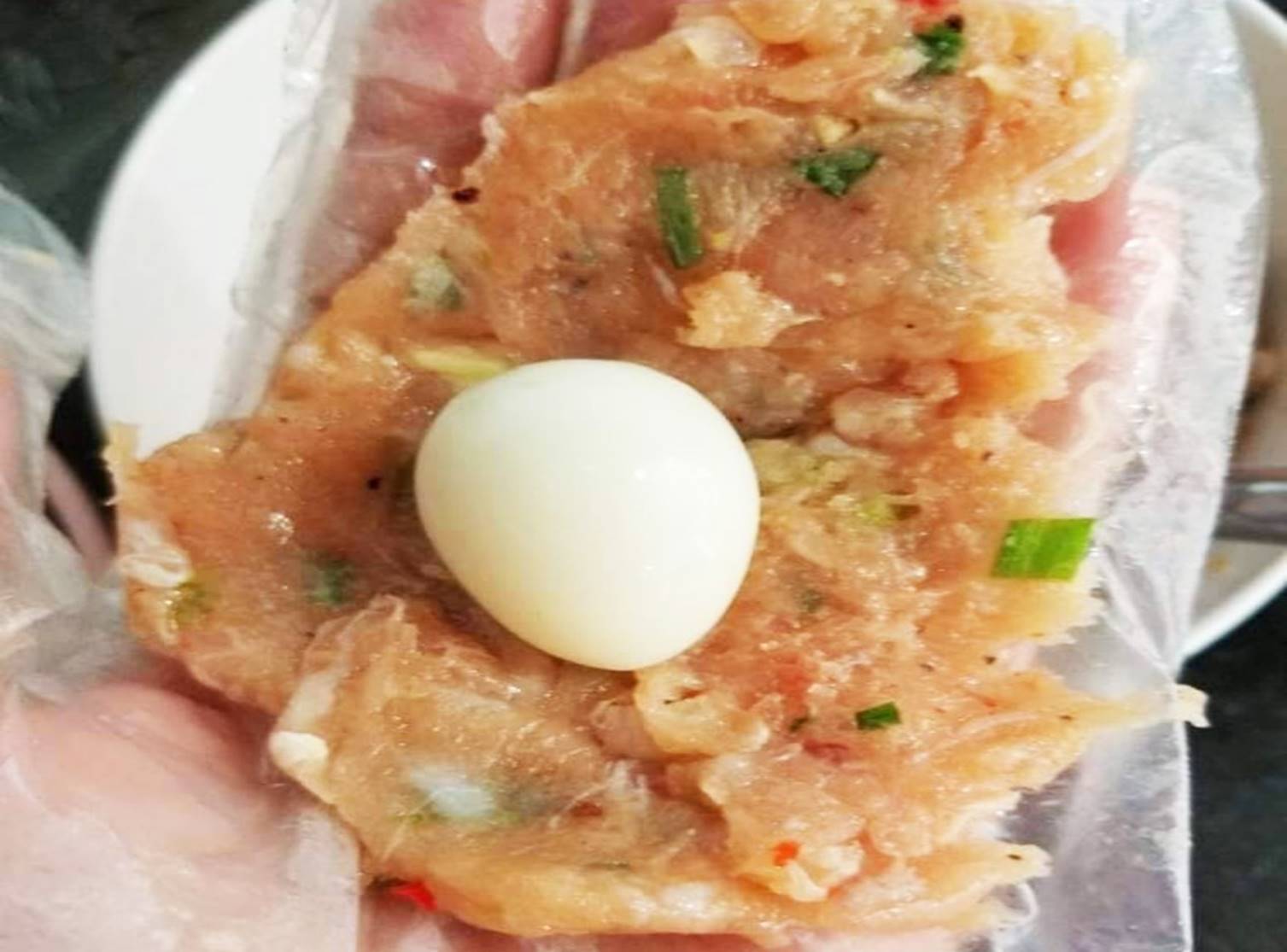 - Cho vào lòng bàn tay 1 muỗng canh chả cá, ép mỏng rồi cho trứng cút vào giữa lớp chả cá.
