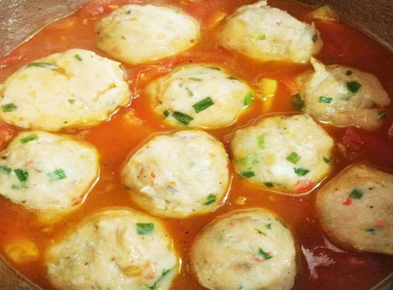 - Như vậy là đã có ngay món cá chả bọc trứng cút sốt cà chua thơm ngon, hấp dẫn với màu đỏ rất bắt mắt của sốt cà chua áo đều xung quanh viên chả.