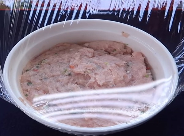 - Sau đó bạn dùng muỗng vừa tán, vừa trộn cho chả cá thấm đều gia vị, tiếp theo dùng màng bọc thực phẩm bọc tô chả cá lại, ướp 15 phút.