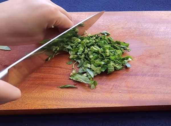 - Cuối cùng bạn cho phần rau thơm cắt nhỏ và 1 quả ớt cắt nhỏ vào rồi tắt bếp nhé!