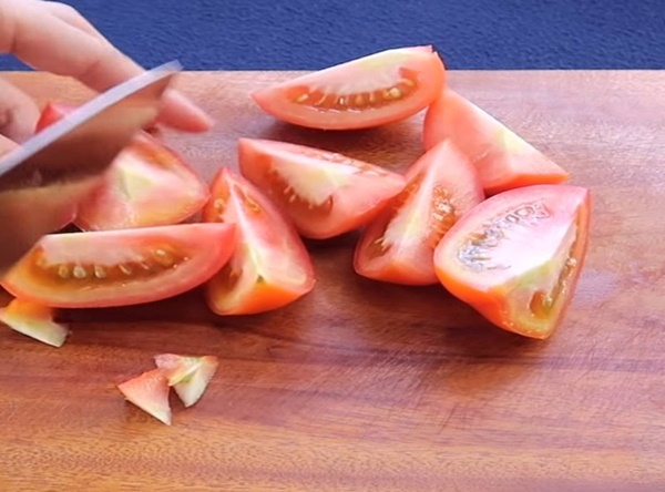 - Đậu bắp bạn rửa sạch, cắt bỏ đầu rồi cắt chéo khoảng 2 lóng tay. Cà chua bạn rửa sach cắt múi cau làm 4 miếng. Thơm mua về bạn gọt bỏ vỏ, rửa sạch rồi cắt nhỏ.
