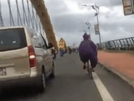 Hình ảnh đẹp: Ô tô di chuyển chậm làm "lá chắn" gió cho xe đạp qua cầu