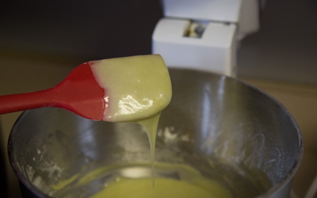 Tiếp tục cho nước cốt lá dứa vào trộn.