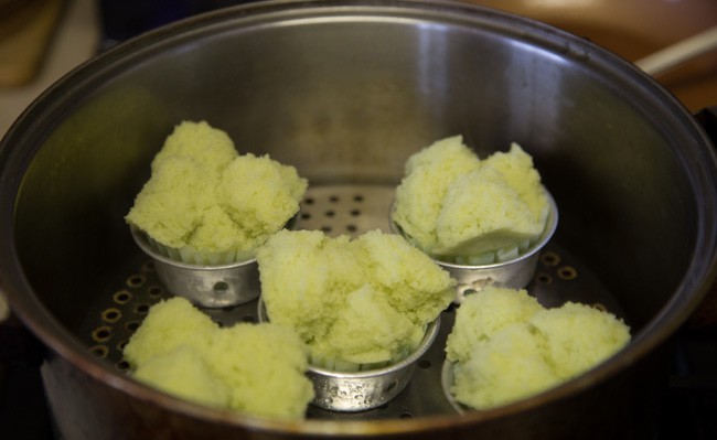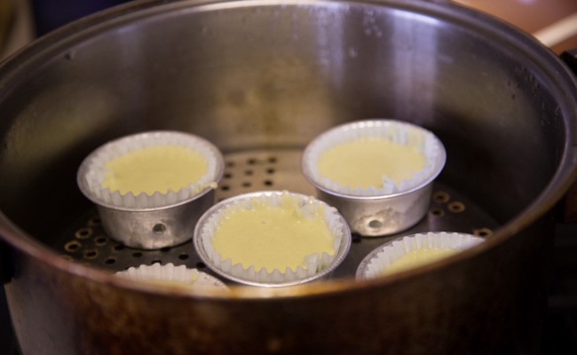 Chia hỗn hợp bột ra từng khuôn nhỏ đã lót sẵn cup giấy. Đặt xửng hấp lên bếp, đun sôi nước thì xếp bánh vào.
