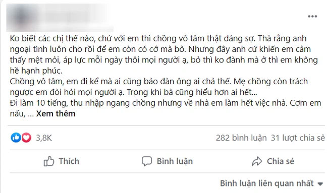 "Chồng vô tâm, em đi kể mà ai cũng bảo đàn ông ai chả thế. Mẹ chồng còn trách ngược em đòi hỏi mọi người ạ. Trong khi bà cũng hiểu hơn ai hết...