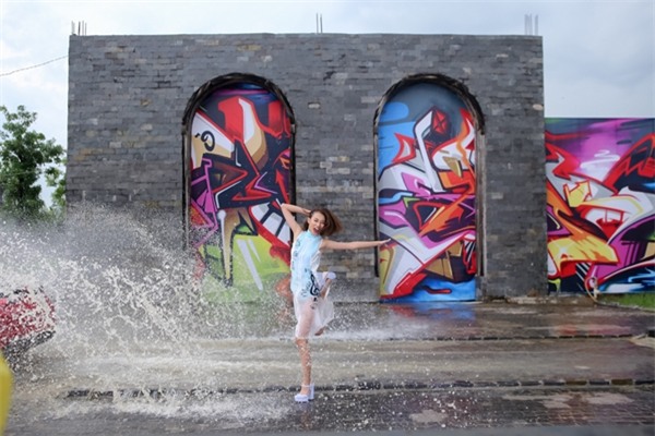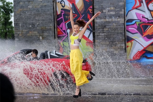 Phần chụp hình team, 4 cô nàng trong đội Hồ Ngọc Hà đã tạo dáng rất tốt với biểu cảm ngạc nhiên xen lẫn vui tươi khi chiếc xe hơi chạy ngang qua và bắn nước tung tóe.