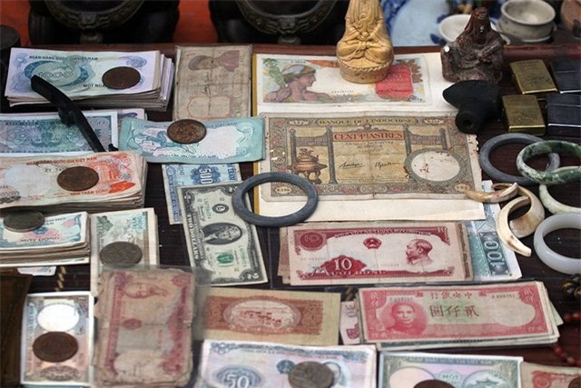 Tiền cũ bày bán tại chợ. Với nhiều người, đi chợ là dịp để được ngắm, được nghe, được bàn luận về những thứ xưa cũ theo phong phong thái lịch sự, nhẹ nhàng trong giao tiếp của người Hà Nội xưa. |