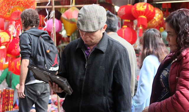 Một vị khác đang say sưa xem đồ tại chợ. Theo thói quen hình thành từ lâu, khách đi chợ có thể ngắm nghía, mân mê thoải mái "mặt hàng" mà không bị phàn nàn. |
