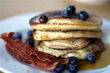 Bánh pancake với thịt xông khói, si rô và quả việt quất.
