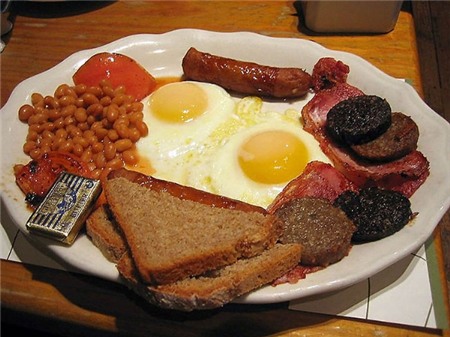 Xúc xích, thịt xông khói, trứng, cà chua nướng, nấm, bánh mì, bánh pudding đen và đậu. Hoàn thiện bữa sáng bằng một tách trà