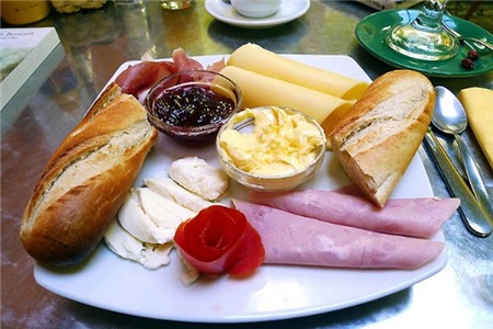 Bữa sáng thường có bánh mì các loại, tương ớt, mứt, phô mai hoặc bơ.