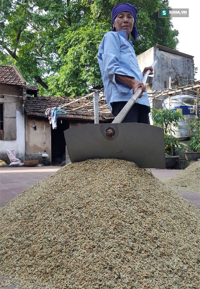 Hôm chúng tôi đến, bà Nguyễn Thị Mỹ, vợ ông Thơm đang còng lưng phơi thóc ngoài sân. Thấy có khách lạ, buông cào thóc, bà tỏ vẻ mừng rỡ.