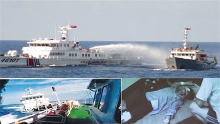 Tàu hải cảnh Trung Quốc dùng vòi rồng phun nước uy hiếp tàu Cảnh sát Biển Việt Nam (ảnh trên); Tàu hải cảnh Trung Quốc đâm vào vách tàu Việt Nam (ảnh trái); Kiểm ngư viên của Việt Nam bị thương do mảnh vỡ trên tàu văng ra (ảnh phải). Ảnh do Cảnh sát Biển |