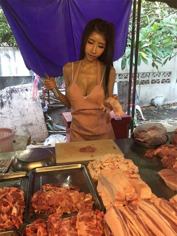 Mới đây, những hình ảnh một cô nàng diện bikini nóng bỏng, đeo chiếc tạp dề màu hồng cùng gương mặt xinh đẹp đứng thái thịt lợn tại một khu chợ tại Bangkok được dân mạng Thái Lan truyền tay nhau chóng mặt.