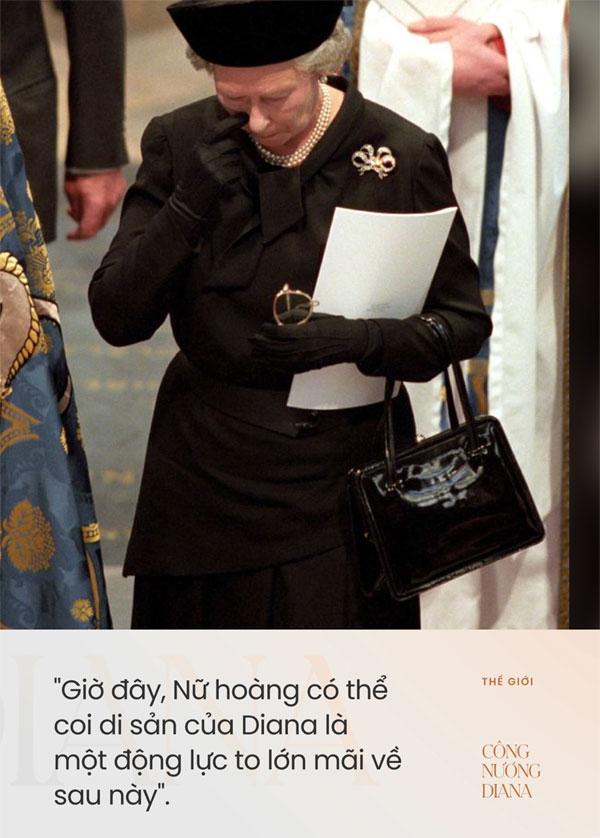 Tuy nhiên, vào ngày 5/9/1997, bà đã có bài phát biểu trên truyền hình với tư cách là cả Nữ hoàng và "một người bà". Di sản Diana để lại trong vị quân chủ rõ rệt nhất có lẽ là qua cách thể hiện tình cảm, có phần bớt lãnh đạm và khắc kỷ hơn những năm trước đây.