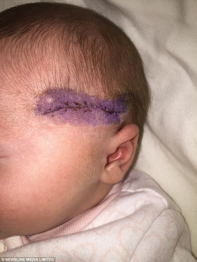 Hình ảnh ghi lại những mũi khâu trên đầu em bé mới sinh.