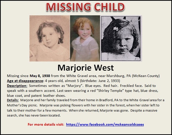 80 năm trước, Marjorie đột ngột biến mất khi đang đi dã ngoại trong rừng cùng gia đình vào Ngày của Mẹ. Cho đến ngày nay, Marjorie vẫn là nạn nhân của vụ mất tích lâu đời nhất được ghi nhận bởi Trung tâm quốc gia hỗ trợ trẻ em mất tích và bị bóc lột.