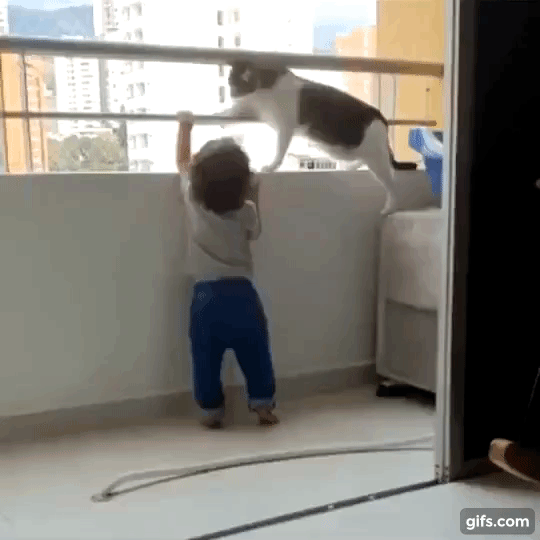 Đoạn video ngắn chưa đầy 1 phút cho thấy một em bé mon men ra ban công và muốn trèo lên trên đó. Con mèo của gia đình đứng ngay bên trên liên tục dùng chân trước hất tay em bé xuống như muốn ngăn cản và cảnh báo nguy hiểm. Đứa trẻ vẫn tiếp tục muốn lên nên tránh sang một bên nhưng con mèo vẫn ngăn cản với một thái độ cực kỳ cương quyết. Sau một hồi bị cản quyết liệt, đứa trẻ cũng bỏ luôn ý định leo trèo nghịch ngợm.