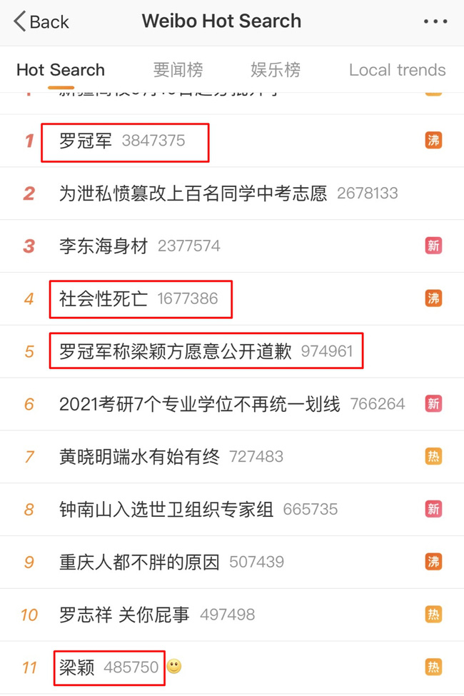 Được biết, sau lời chia sẻ này, cái tên "La Quán Quân", "Lương Dĩnh" và sự việc này tiếp tục trở thành chủ đề được quan tâm và tìm kiếm nhiều thứ 1, thứ 4, thứ 5 và thứ 11 trên MXH Weibo. Hiện tại, Lương Dĩnh đã xóa tất cả các bài tố cáo của mình mặc dù đã có hơn 440 nghìn lượt chia sẻ.
